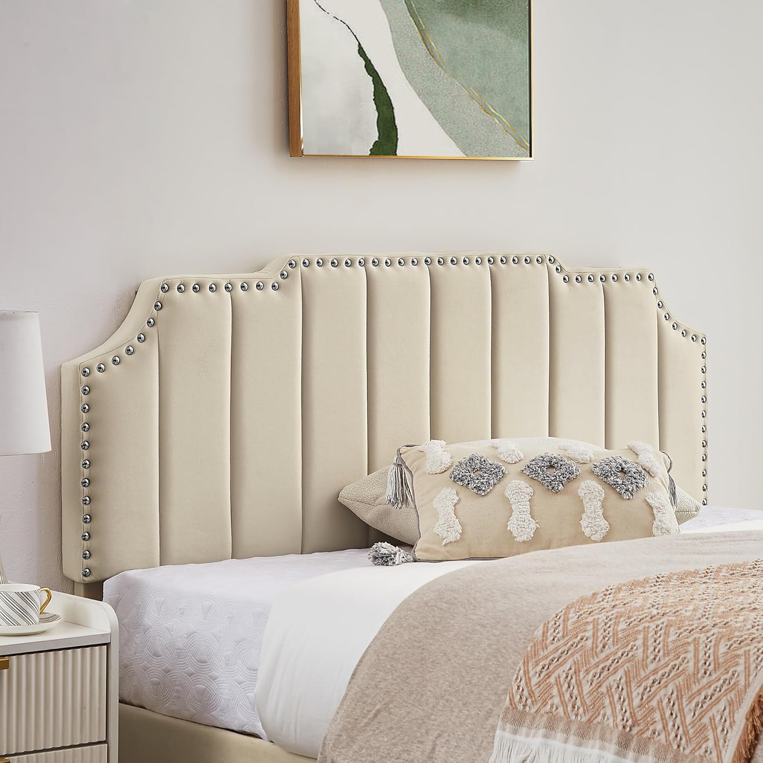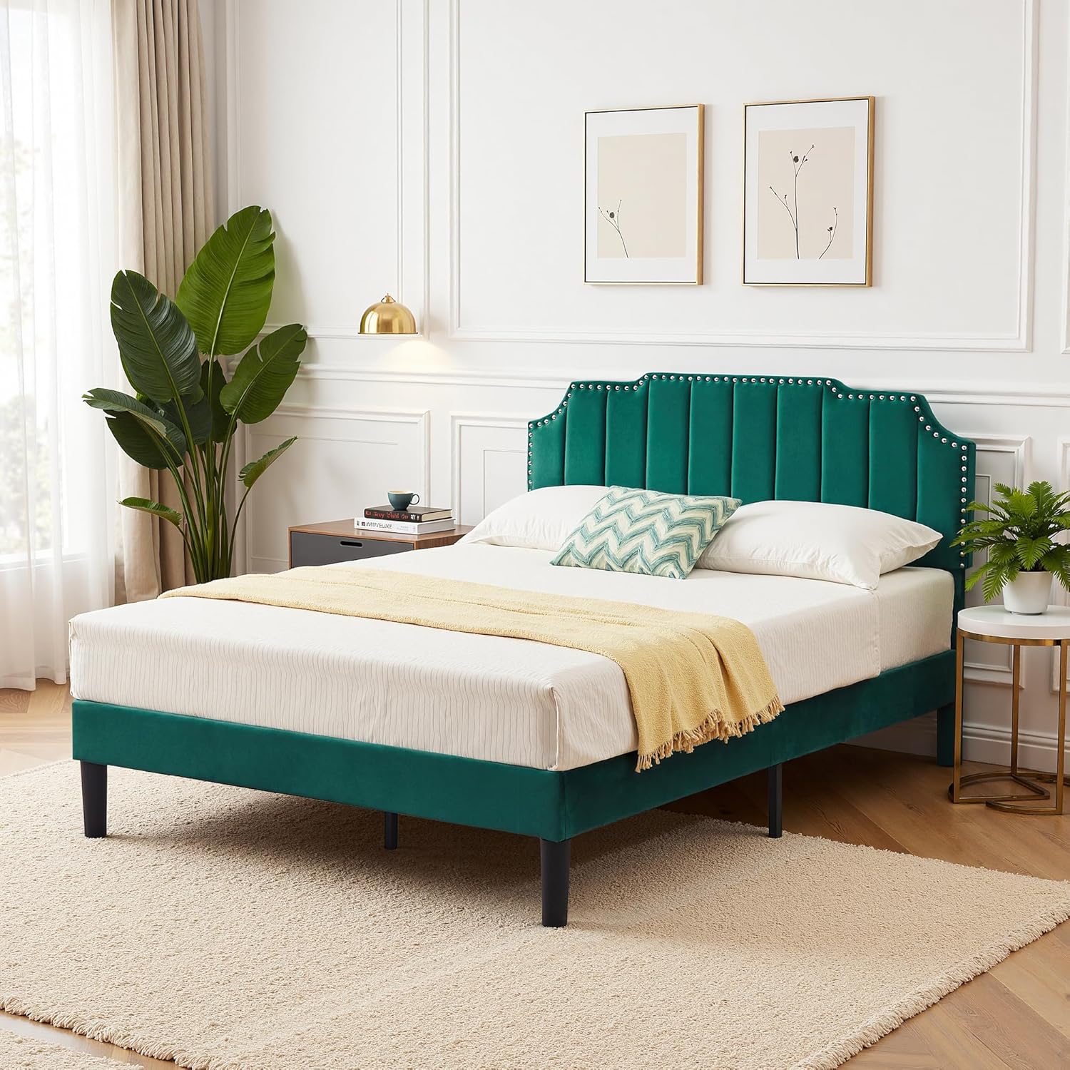 Advantages:Retro Luxury: The velvet soft upholstery not only exudes the refined elegance of French light luxury but also features classic elements of American retro style such as rivets, making it suitable for rooms of various styles.Velvet-Upholstered Fabric: The surface is upholstered in velvet fabric, offer a luxuriously soft and smooth touch. The fabric’s rich sheen adds a touch of elegance and warmth to the bedroom, creating a cozy and sophisticated atmosphere.Sturdy and Durable: This bed frame is sturdy and durable,made of high-quality metal and wood,12pcs of wooden slats and center steel slats support .With anti-scratch foot cover, which can reduce friction to protect the floor from scratching.Height-Adjustable Headboard: The height-adjustable panel headboard ranges from 41.7" to 47.7", It fits perfectly for mattresses with a height of 6 -12 inches.No Box Spring Needed: Designed with solid wood slats, the mattress doesn't slide around on it, memory foam or spring mattress without the need for a box spring.Under Bed Storage: 7.9 inches height clearance under the bed,maximizing the use of bedroom space,and making it look more organized and tidy.Specifications:Bed Frame Color: Gray/Beige/Pink/Green/BlueMetal Bed Frame Dimension: 62.8 x 81.3 x 47.7in (Queen Size) Max Load: 800 lbs(queen)Package Includes:1 x Bed Frame1 x Instruction1 x Assembly Kit